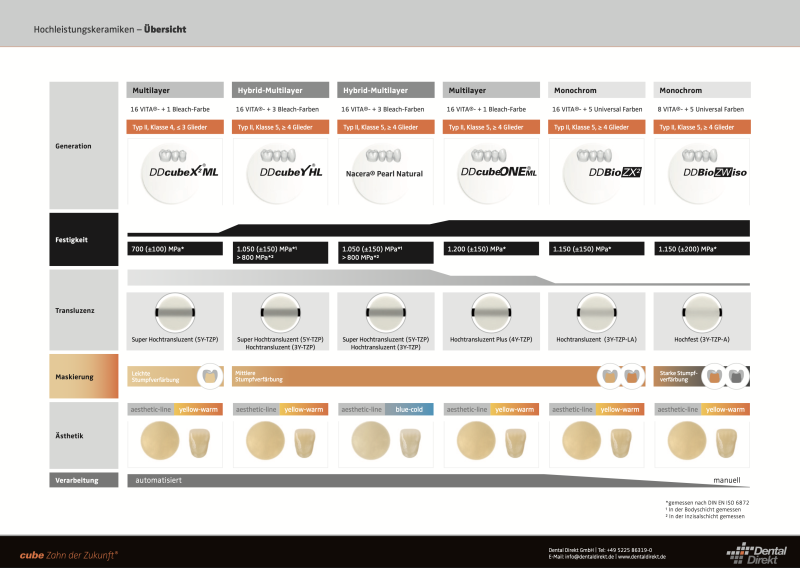 DD cubeY® HL Zirconia е 5Y/3Y многослойна циркониева керамика от най-висок клас, създадена за производство на естетични и функционални зъботехнически конструкции с големи обхвати. Благодарение на своята хибридна структура и плавен преход между слоевете, материалът предлага перфектен баланс между прозрачност, здравина и естествена естетика.