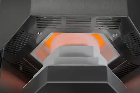 Пещта разполага с четири висококачествени нагревателни елемента от молибденов дисилицид (MoSi₂), осигуряващи равномерно и контролирано нагряване. Благодарение на мощната система може да се избира между стандартно продължително синтероване и ускорено SPEED синтероване със скорост до 120°C/минута, при максимална температура 1650°C.